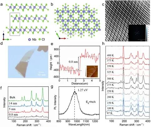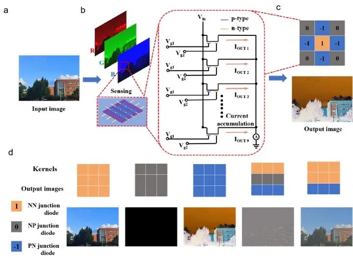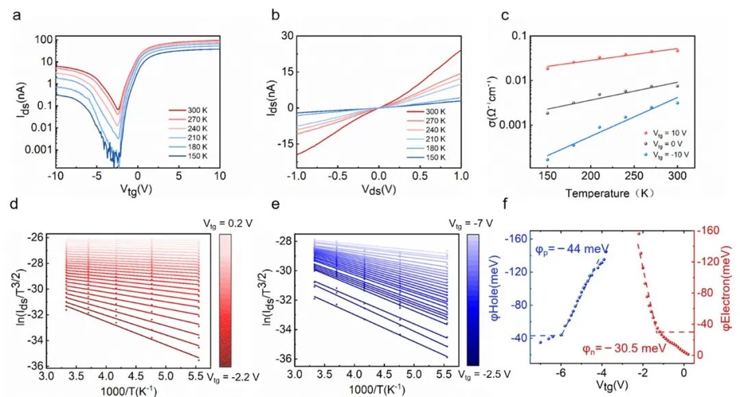 随着信息技术的快速发展,新型二维量子材料因其独特的电子性质和潜在的应用前景成为凝聚态物理和材料科学的研究热点。其中,Kagome结构材料因其特殊的晶格排列和强电子关联特性,展现出拓扑平带、关联绝缘态等新奇量子现象。然而,大多数Kagome材料为金属或半金属,缺乏良好的开关比,限制了其在逻辑器件中的应用。近年来,呼吸Kagome半导体Nb₃X₈(X = Cl, Br, I)因其具有拓扑平带、多铁耦合等丰富的物理特性,引起了广泛关注。尤其值得注意的是,Nb₃Cl₈易于剥离和半导体特性为构建可重构电子器件提供了理想平台。然而,如何实现基于该类材料的功能器件,尤其是实现可编程、双极性操作的晶体管,仍是一个重大挑战。本研究通过机械剥离法制备了少层Nb₃Cl₈薄片,并采用六方氮化硼(h-BN)作为顶栅介质,构建了双栅极场效应晶体管。研究发现,以SiO₂为介质时器件存在显著滞后效应,而h-BN原子级表面有效抑制了界面电荷陷阱,实现了清晰的双极性传导行为,开关比超过10³。基于Nb₃Cl₈的双极性特性,研究团队进一步设计并制备了局部双栅控制的PN结晶体管。通过独立调控两个栅极电压,单个晶体管可动态重构为PN、NP、PP及NN四种导电状态,实现多态逻辑输出(“1”、“0”、“-1”)。利用这一可编程特性,团队构建了3×3晶体管阵列作为硬件卷积内核,成功演示了多种图像处理功能,包括图像复制、边缘检测和图像反转等,展现了其在神经形态计算与高效并行处理中的应用潜力。该研究成果以“Reconfigurable bipolar transistors enabled by breathing-Kagome Nb₃Cl₈”为题,已在线发表于国际权威期刊《Materials Horizons》上。华东师范大学为论文第一完成单位,魏鹿奇博士研究生、黄家豪硕士研究生以及中国科学院物理研究所的马之杰博士研究生为论文的共同第一作者,钟妮教授、关赵副研究员为论文通讯作者。合作者还包括华东师范大学极化材料与器件教育部重点实验室的段纯刚教授、向平华教授、陈斌斌研究员、王亚琼副研究员、童文旖副研究员、蒋亚飞硕士研究生和中科院物理研究所的石友国研究员。研究工作获国家重点研发计划、国家自然科学基金、上海市科技创新行动计划的资助,并得到了极化材料与器件教育部重点实验室、上海类脑智能材料与器件研究中心和华东师范大学公共创新服务平台微纳加工中心的支持。(a–b)Nb₃Cl₈的晶体结构侧视图与俯视图;(c)侧向力显微镜的原子分辨晶格图;(d)机械剥离薄层的光学图像;(e)单层厚度表征;(f)不同层数Nb₃Cl8的拉曼光谱;(g)PL测量显示带隙约为1.27 eV;(h)变温拉曼光谱。图2. Nb₃Cl₈双栅极晶体管结构与电学特性表征(a)器件光学图像;(b)双栅极结构示意图;(c–d)顶栅与底栅的输出曲线;(e–f)转移曲线显示SiO₂栅介质存在滞后现象,而h-BN可实现清晰的双极性传导,开关比超过10³。(a)变温转移曲线;(b)变温输出曲线;(c)电导率随温度与栅压变化;(d–e)n型和p型导电的Arrhenius曲线;(f)在不同栅压下提取的有效势垒高度。(a)器件结构示意图;(b)四种状态下(NN, PP, NP, PN)的输出特性;(c–d)在不同栅压组合下的输出电流映射;(e)能带示意图;(f)多态输出逻辑(“1”、“0”、“-1”)的实现。附论文链接:https://doi.org/10.1039/d5mh01103e