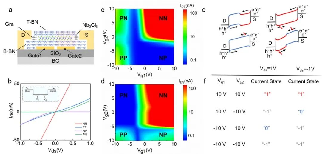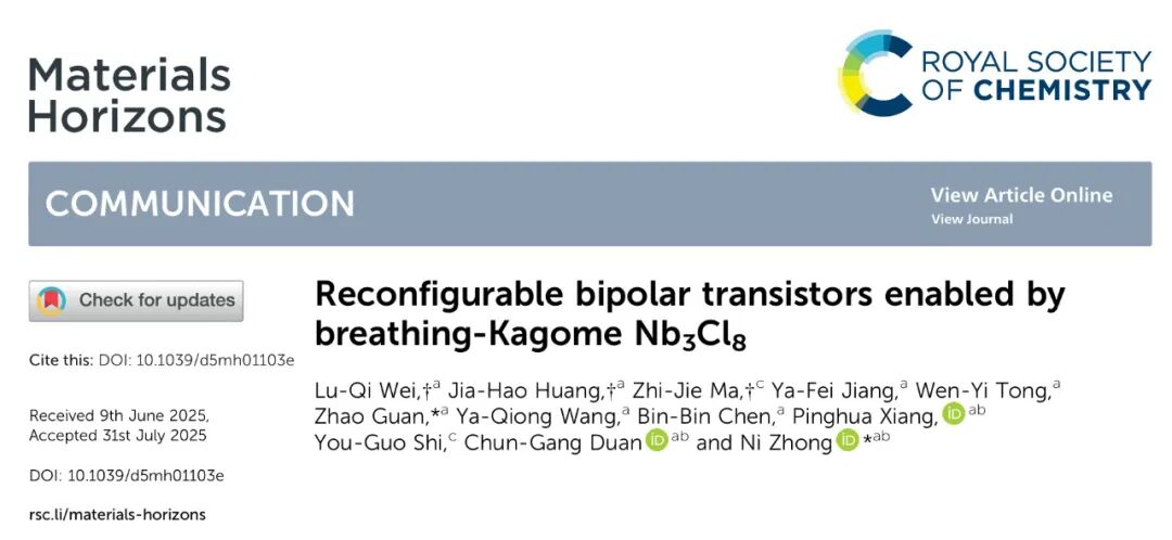 华东师范大学极化材料与器件教育部重点实验室钟妮教授团队,成功基于呼吸Kagome半导体Nb₃Cl₈制备出可重构双极性场效应晶体管,通过双栅极调控实现了在PN、NP、PP、NN等多种导电状态之间的动态切换,并进一步演示了其在卷积图像处理中的应用。该研究成果以“Reconfigurable bipolar transistors enabled by breathing-Kagome Nb₃Cl₈”为题,已在线发表于国际权威期刊《Materials Horizons》上。